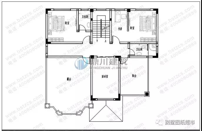 三 層:活動室、臥室(附衛(wèi)生間)、臥室(附書房)、衛(wèi)生間、陽臺、露臺