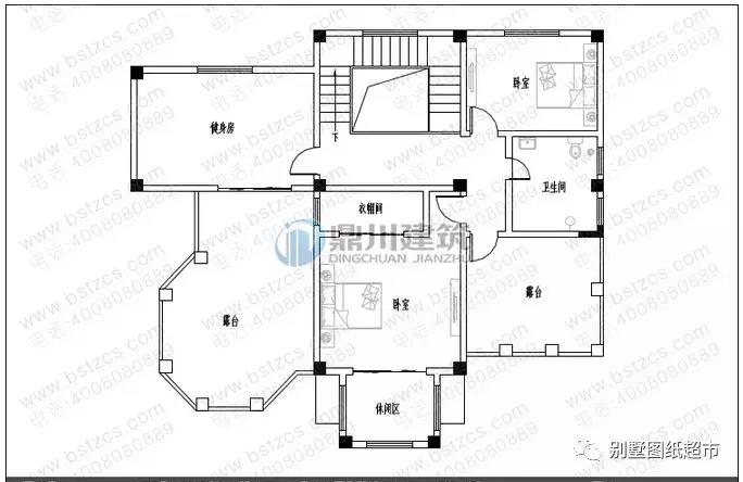 三 層:健身廳(附露臺)、臥室(附書房,衛(wèi)生間)、臥室(附露臺)、臥室、衛(wèi)生間、露臺