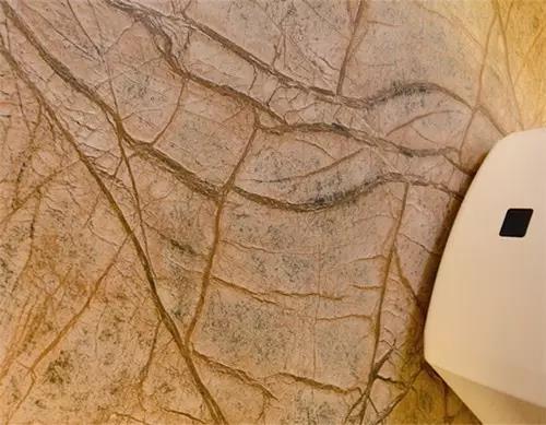 金啡洞產(chǎn)品紋理以金黃色漸變?yōu)樘厣瑢傧∮械V產(chǎn)資源大理石品種,凹凸小坑手感細(xì)膩,立體的視覺震撼,使得整個(gè)空間充滿著強(qiáng)烈的文化和歷史韻味。