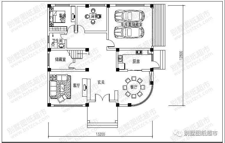 一 層:客廳、麻將室、客房、廚房、餐廳、衛生間、儲藏室、車庫