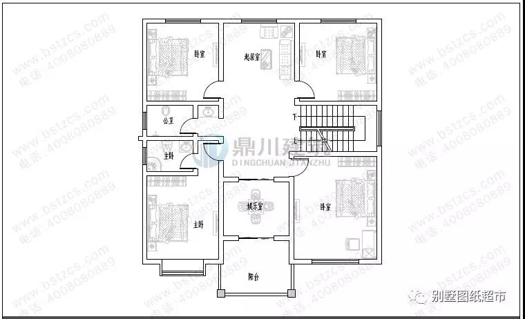 二 層:起居室、娛樂室(附陽臺)、臥室(附衛生間)、3臥室、衛生間