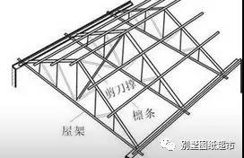 房間開間較大、不能用山墻承重的建筑,須設置屋架以支承檁條。屋架由桿件組成,為平面結構,可用木材、鋼筋混凝土、預應力混凝土或鋼材制作,也可用兩種以上材料組合制作。屋架有三角形、拱形、多邊形等,以三角形為多。屋架的間距一般與房屋開間尺寸相同,通常為3~4.5米。