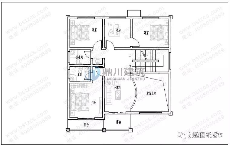 二層:帶一個小客廳,三個臥室,一個公用衛生間,其中一個臥室帶單獨衛生間和陽臺,還有一個臥室帶書房。