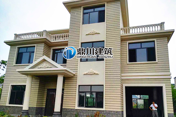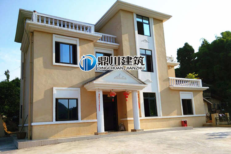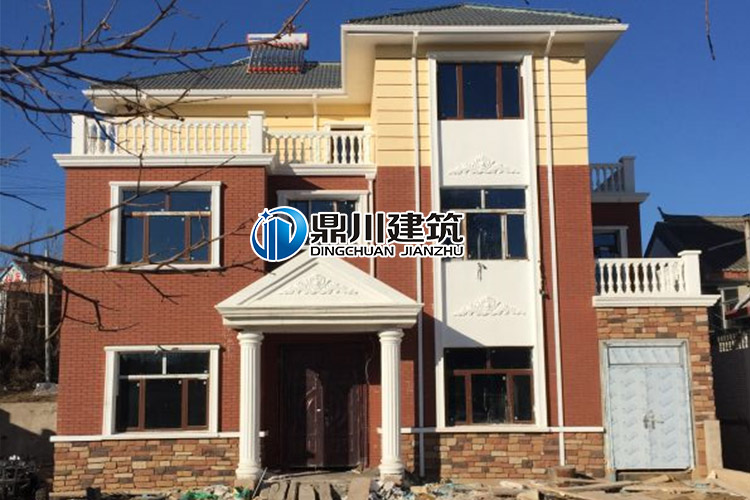 第一款建造實拍的戶主采用了黃色瓷磚來裝飾外墻,瓷磚打造的層次感和線條感,讓這款別墅看上去舒適自然。再加之外墻以羅馬柱、山花、花瓶柱來輔助裝飾,這些小小的歐式構件成了整套別墅外觀的點睛之筆。