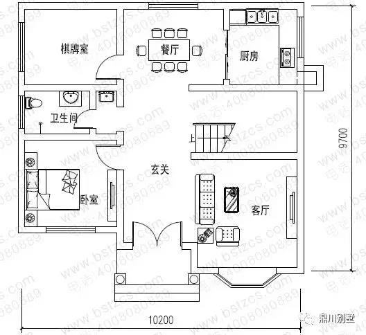 一 層: 玄關、客廳、臥室、棋牌室、廚房、餐廳、衛生間