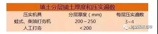 4.碾壓密實:填土分層鋪土的厚度和壓實遍數(shù),應結合壓實機具,參照表上進行;