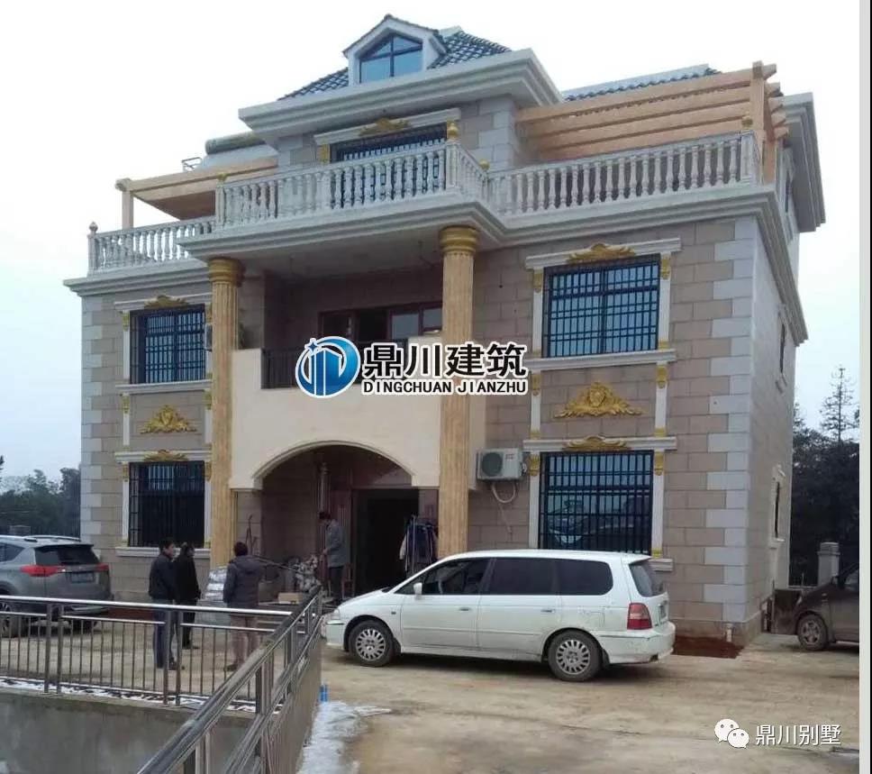 第二款案例,在造型上做了稍微的調整,三層的二個相鄰的窗戶改成了一個,左右的露臺分別設置了一個露臺架。金色的羅馬柱和金色的山花貴氣又大方。
