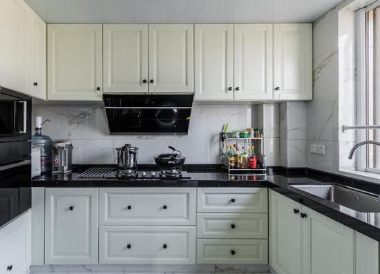 ▲廚房做U型櫥柜設計,將烤箱等家用電器嵌入,黑白搭配呈現出清爽利落的感覺。