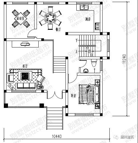 一 層: 客廳、臥室、活動室、廚房、餐廳、衛生間、陽臺