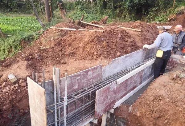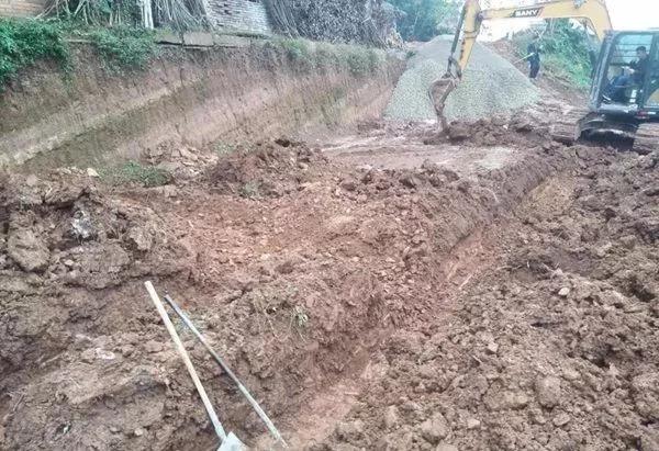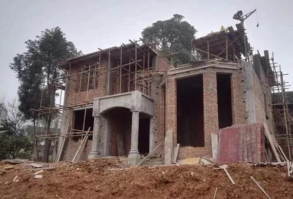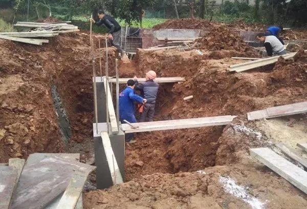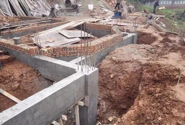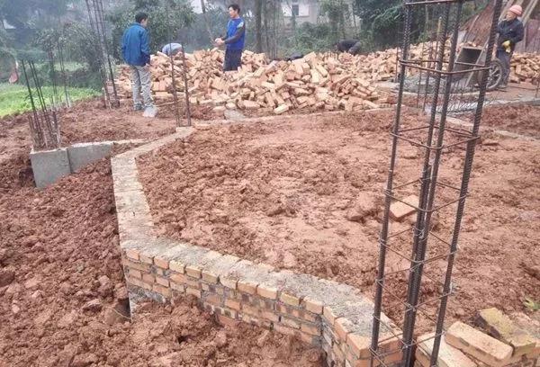 房主選擇建房的地塊原本是塊坡地,后面緊靠原鄉政府公社房屋,前面就是稻田了。房主把場地平整之后,實地丈量了尺寸,撒了灰線,辦了開工儀式,就開始建房了! 因為是坡地平整下來的,所以后面的地基很好,但是前面卻有很高的回填土。基礎開挖到持力層后,發現前后的高差有2米多,這種情況不適合采用原圖紙設計的條形基礎,我們就請結構工程師根據現場情況對基礎進行了設計變更,采用了局部獨立柱基礎和加大地梁的方法進行處理。