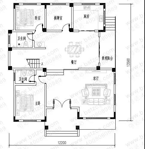 一 層: 客廳、臥室(附衛生間)、臥室、棋牌室、廚房、餐廳(附景觀陽臺)、衛生間