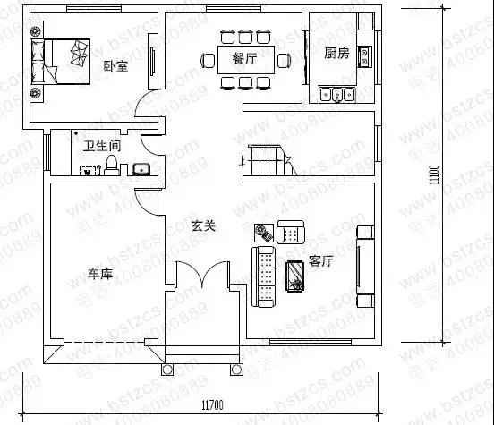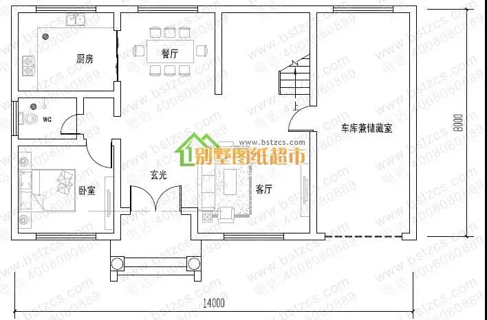 一 層: 客廳、臥室、廚房、餐廳、衛生間、車庫(兼儲藏室)