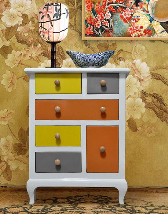 此款斗柜的柜體為白色,每一格抽屜的面板則涂刷了不同的色彩,色塊的拼接顯示出十分現(xiàn)代、時(shí)尚的設(shè)計(jì)理念。