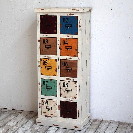 做舊質(zhì)感的一款斗柜,剝落的漆面充滿年代感與懷舊感,不同顏色的小方格抽屜則極具躍動(dòng)感,抽屜上的編號(hào)設(shè)計(jì)也是意趣十足。
