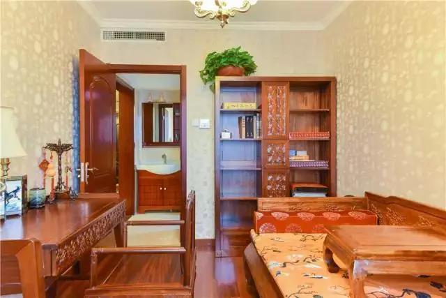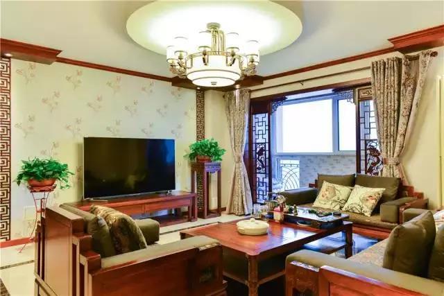 ▲古色古香的木質(zhì)沙發(fā)、茶幾和柜子,電視背景墻的中式風(fēng)格壁紙還有陽(yáng)臺(tái)的中式雕花隔斷,營(yíng)造出很強(qiáng)的古典中式韻味。