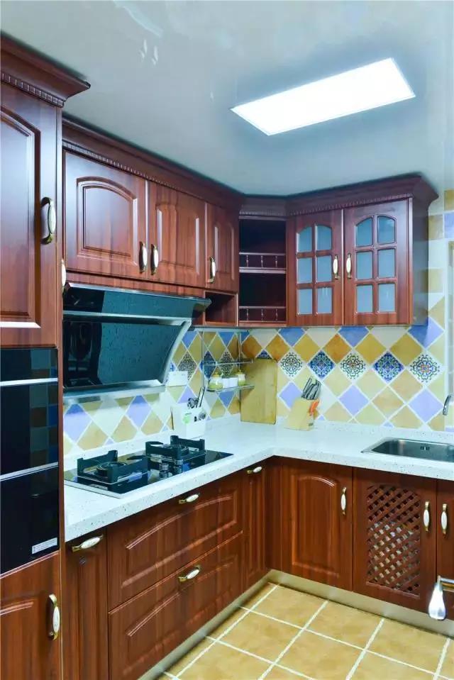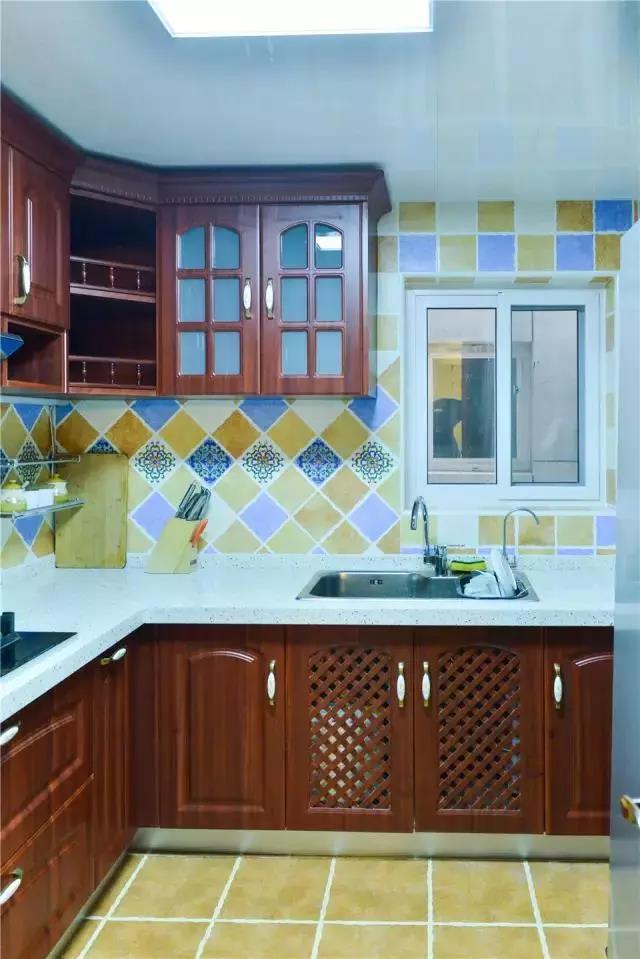 ▲廚房用了花色墻磚,很有活力,與這樣的櫥柜搭配起來(lái)效果很好