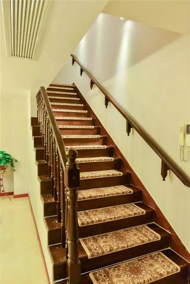 ▲樓梯兩邊都做了扶手,鋪了古典花色地毯很典雅。