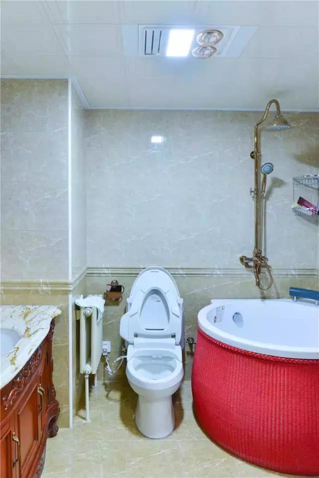 ▲圓形造型的浴缸,是不是跟古時(shí)候的圓木桶很像,外面還包了一層紅色裝飾真的很亮眼!