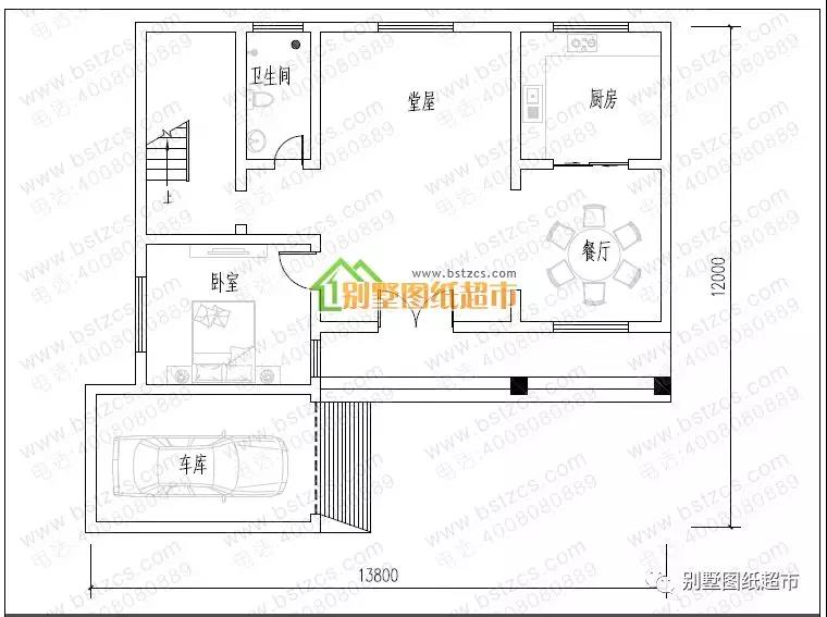 一 層:堂屋、臥室、廚房、餐廳、衛生間、車庫