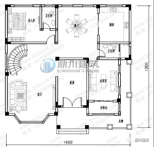 一 層:走廊、堂屋、客廳(中空)、會客室(附內陽臺)、臥室(附衛生間)、廚房、餐廳、衛生間