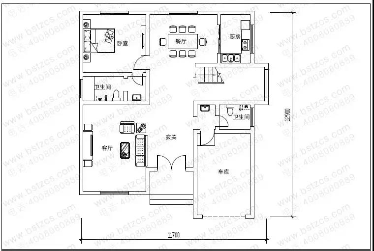 一 層:門廳、客廳、2臥室、廚房、餐廳、衛生間、車庫