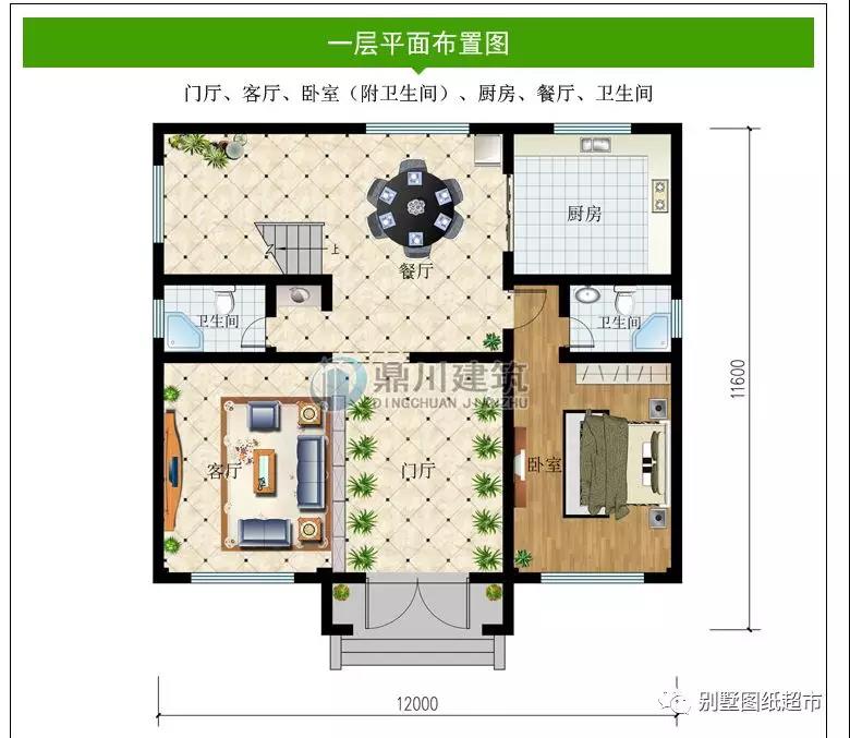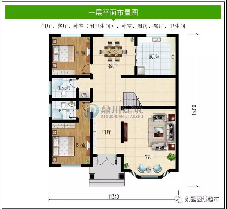 一 層:門廳、客廳、臥室(附衛生間)、廚房、餐廳、衛生間