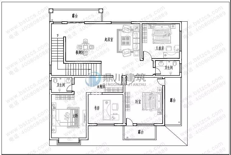 二 層:客廳(附露臺)、臥室(附衛生間,陽臺)、臥室(附書房)、臥室、衛生間
