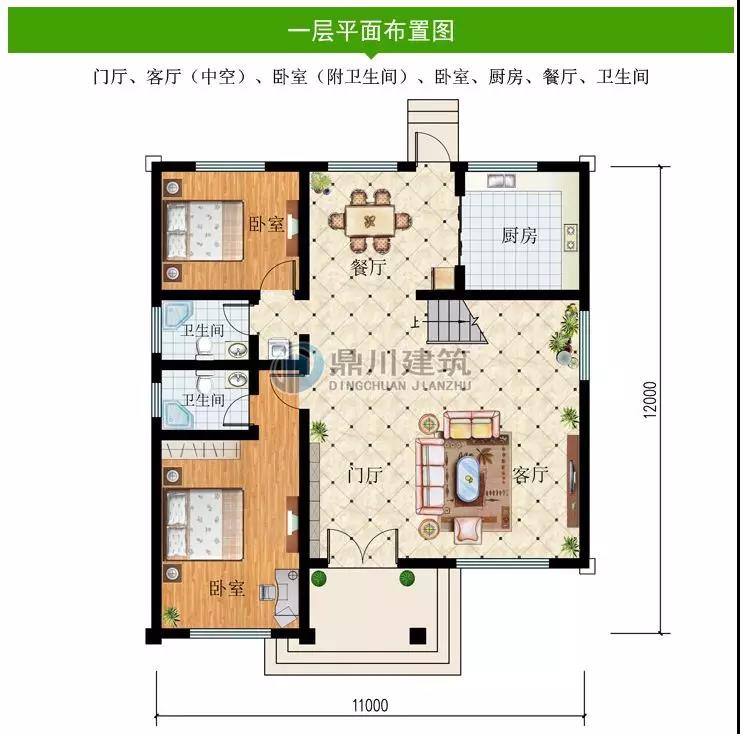 一 層:門廳、客廳(中空)、臥室(附衛生間)、臥室、廚房、餐廳、衛生間
