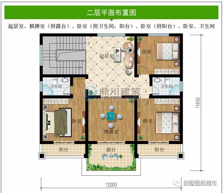 二 層:起居室、棋牌室(附露臺)、臥室(附衛生間,陽臺)、臥室(附陽臺)、臥室、衛生間