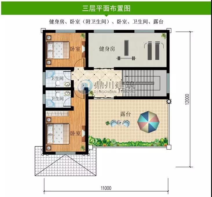三 層:健身房、臥室(附衛生間)、臥室、衛生間、露臺