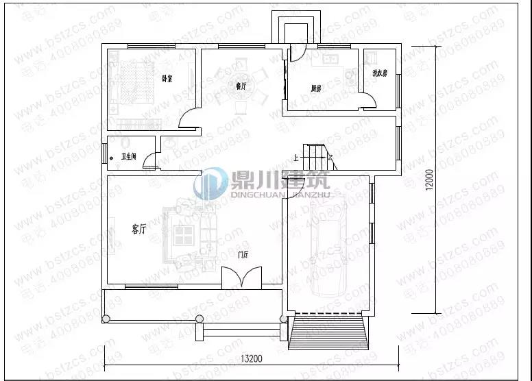 一 層:客廳、臥室(附衛生間)、廚房、餐廳、衛生間、車庫