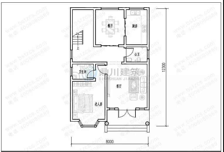 一 層:客廳、臥室(附衛生間)、廚房、餐廳、衛生間