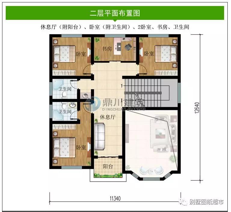 二 層:休息區(附陽臺)、臥室(附衛生間)、2臥室、書房、衛生間