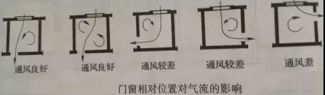 房間內的通風不止受門的位置影響,也受到窗戶的制約,為了達到優良的通風效果,門的位置應盡量與窗相配合,可以形成穿堂風,加大通氣范圍。具體位置如下圖所示。