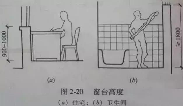對于特殊位置的窗臺,如衛生間、浴室以及房屋后窗,為了保證隱私,高度可以設置為1800mm。設火炕的農村住宅,窗臺一般高于火炕200~300mm。