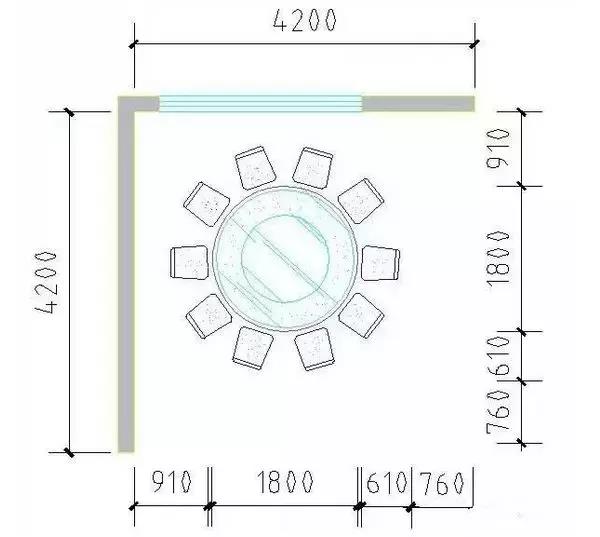 享受型餐廳一般設計供10人以上餐桌,某些戶型會有將早餐廳結合廚房設計,根據人的活動空間及餐桌擺放,靠墻利用在4000mm以上,保證通行暢通。