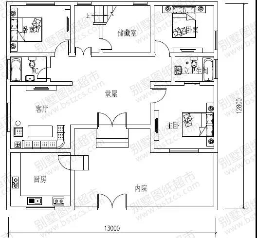 一 層: 內院、堂屋、客廳、臥室(附衛生間)、2臥室、廚房、儲藏室、衛生間