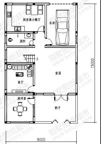 一 層: 院子、麻將室、堂屋、客廳、廚房兼餐廳、衛生間、車庫