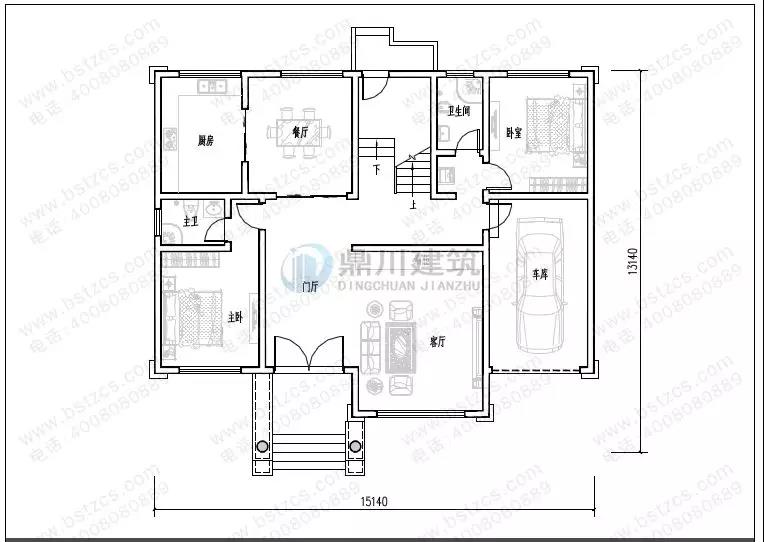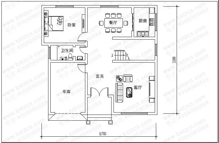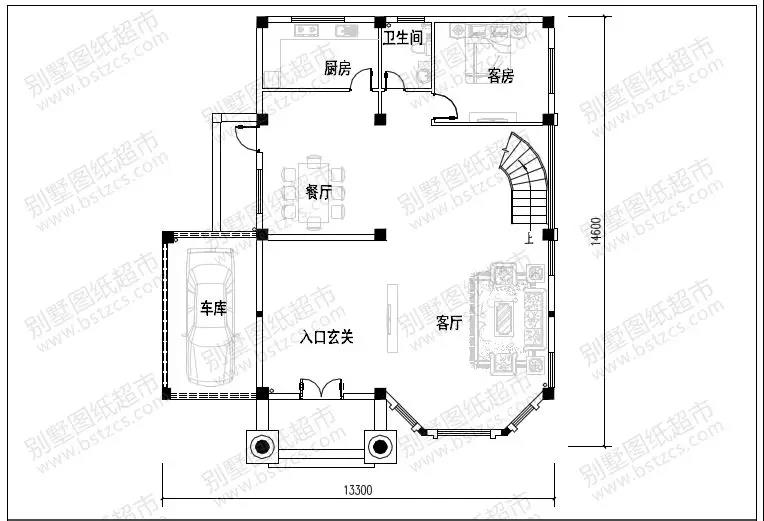 一 層:入口玄關(guān)、客廳、餐廳、廚房、客房、衛(wèi)生間、車庫