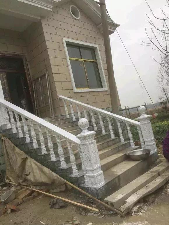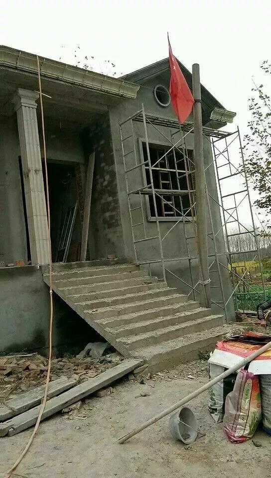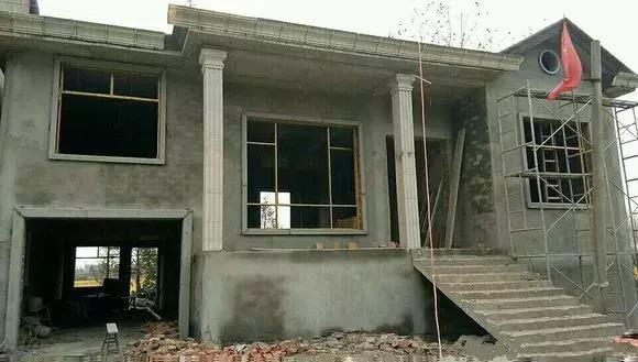 裝修中,外墻選擇仿真石漆,羅馬柱和花瓶欄桿,窗口檐是定做的。