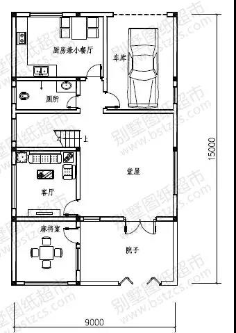 一 層: 院子、麻將室、堂屋、客廳、廚房兼餐廳、衛生間、車庫
