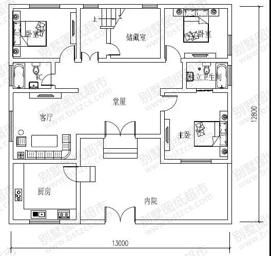一 層: 內院、堂屋、客廳、臥室(附衛生間)、2臥室、廚房、儲藏室、衛生間