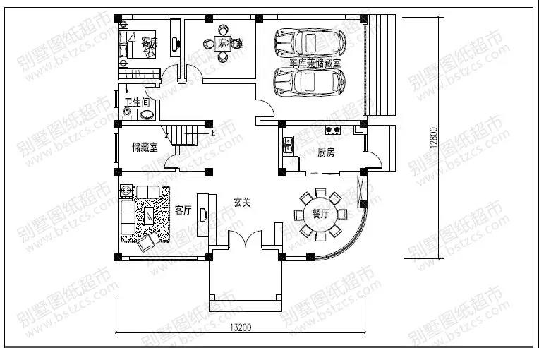 一 層:客廳、麻將室、客房、廚房、餐廳、衛生間、儲藏室、車庫