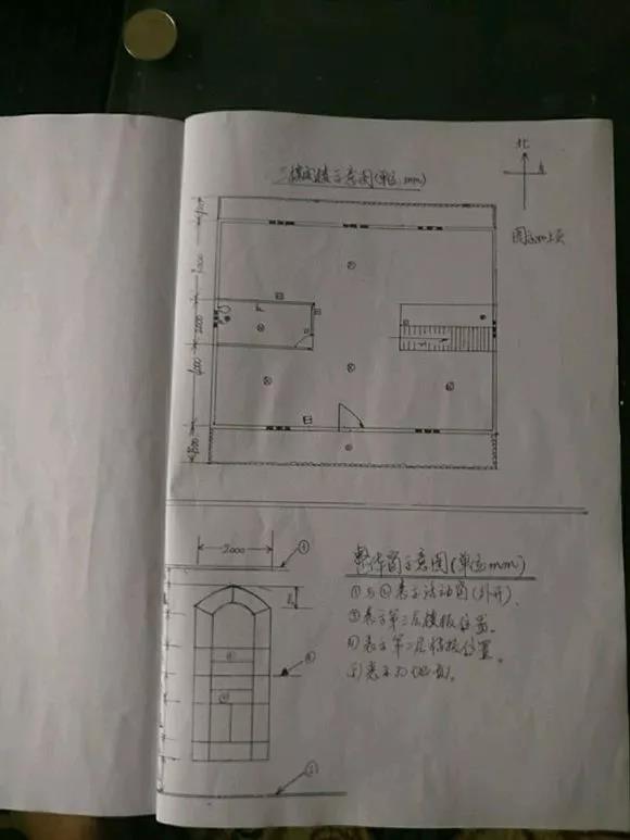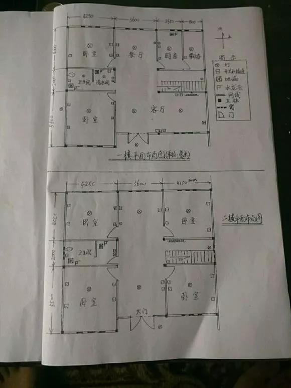 房子總計建筑使用面積390平方,這是手畫的平面圖草稿,基本就是按照這個樣子建。