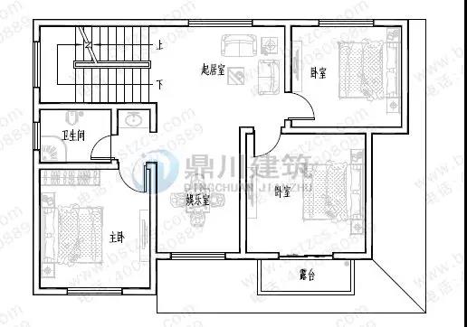 二 層: 客廳、臥室(附衛(wèi)生間,陽臺)、臥室、書房、娛樂廳(附露臺)、衛(wèi)生間