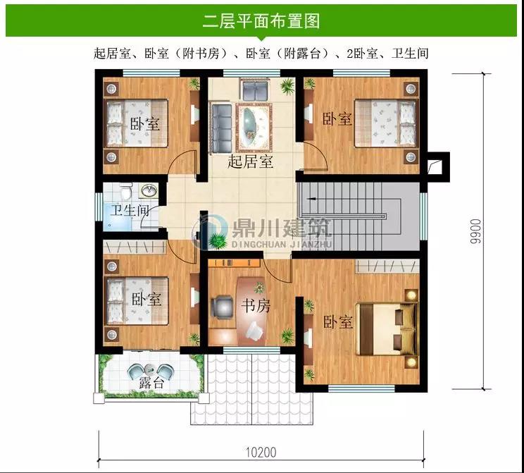 二 層:臥室、臥室(附陽臺)、臥室(附書房,衛(wèi)生間,陽臺)、衛(wèi)生間