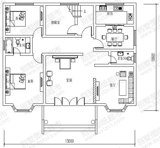 一 層:堂屋、客廳、主臥(附衛(wèi)生間)、臥室、廚房、餐廳、儲藏室、衛(wèi)生間