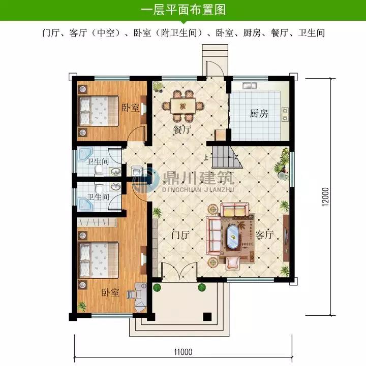 一 層:門廳、客廳(中空)、臥室(附衛(wèi)生間)、臥室、廚房、餐廳、衛(wèi)生間