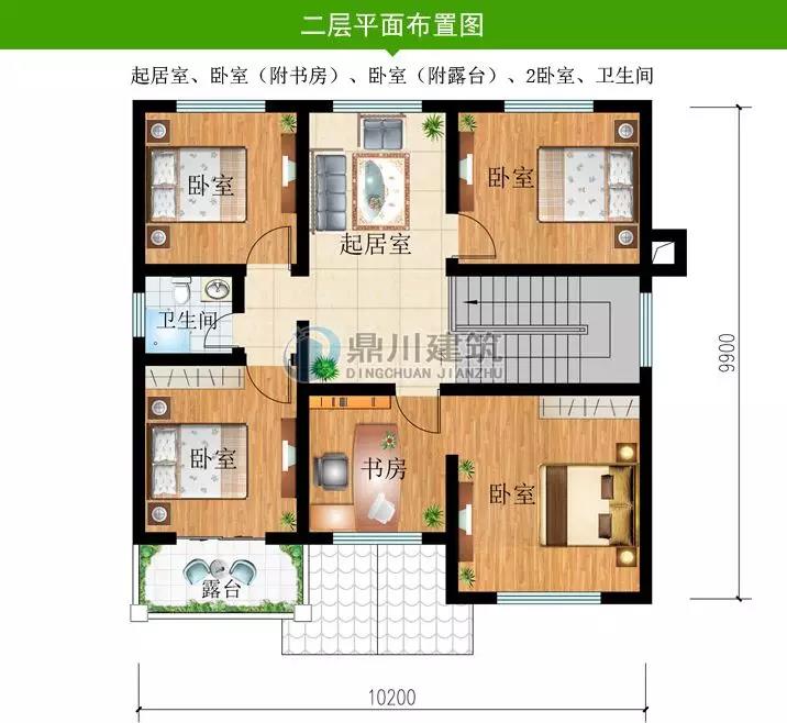 二 層:客廳(附露臺)、臥室(附衛(wèi)生間,陽臺)、臥室(附書房)、臥室、衛(wèi)生間