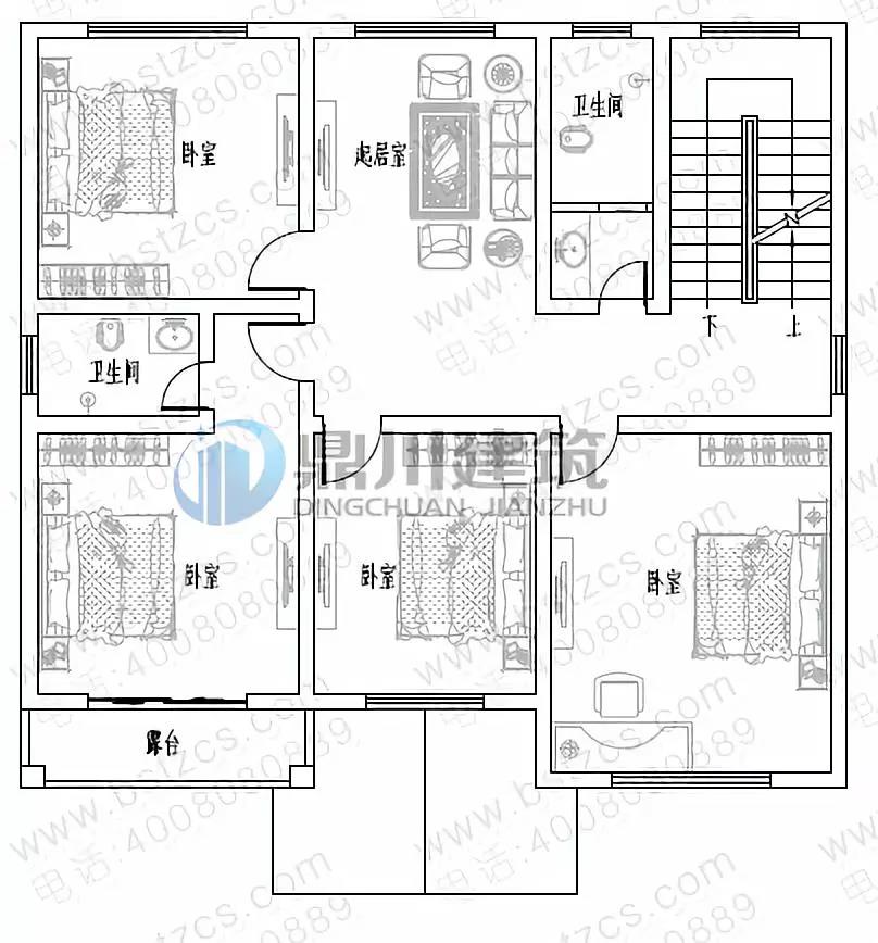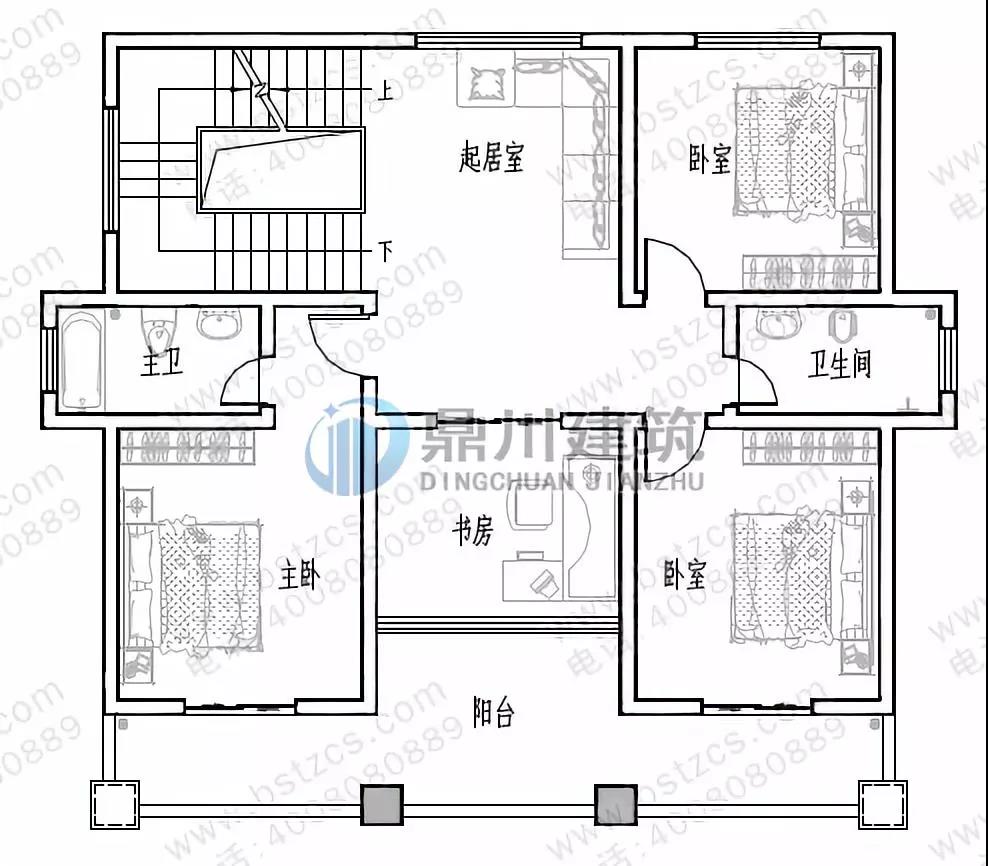 二 層:起居室、臥室(附衛(wèi)生間,陽臺)、臥室(附陽臺)、臥室、書房、衛(wèi)生間